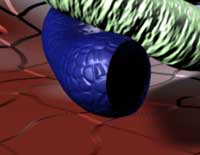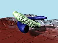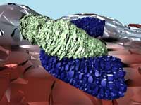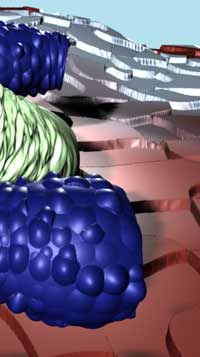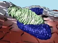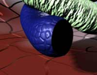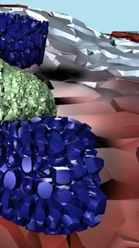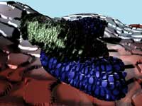 I created a scene with a deformed polygon "floor" bump-mapped with a checker texture, slightly randomized, and two modified NURBS toruses, one mapped with a green fractal texture and the other with a blue 3D leather texture. There are two lights in the scene, one of which casts shadows. The following three images all took about the same time to render and they look very much alike. The following 6 illustrations show the scene, rendered with Maya Software, Mental Ray and Renderman (right). In the close-ups of the second row you see differences: Renderman interprets the 3D leather map differently from the other packages. But you'll discover differences between Maya Software and Mental Ray (middle) as well. |