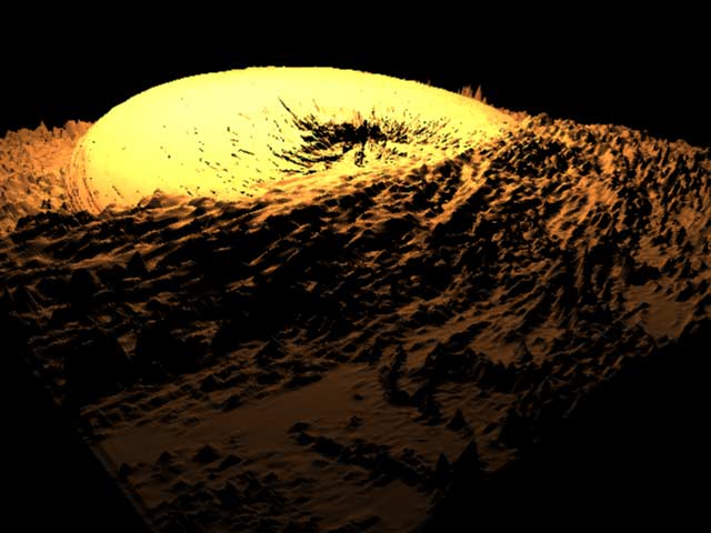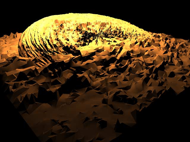 Boden und Kugel bekamen das Foto eines Hurricanes als Displacement Map verpasst. Anschließend habe ich die Szene, wie sie ist, gerendert, mit allen drei Renderern in ihren Standard-Einstellungen. Das kam dabei heraus: |