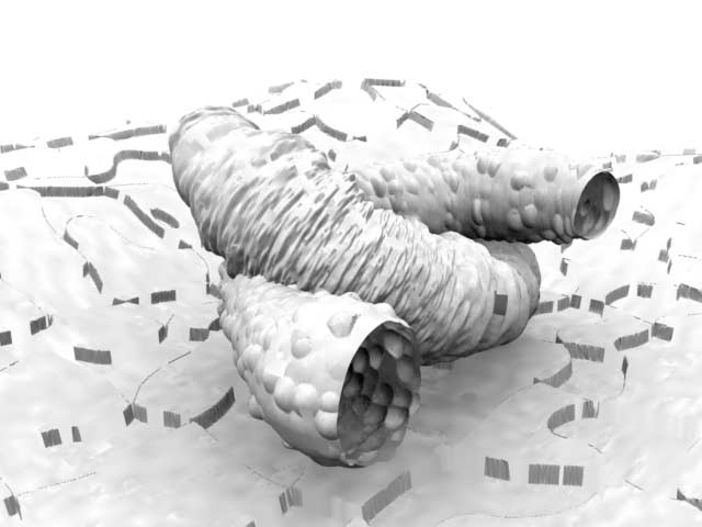 Ach so: Renderman rendert durchaus auch Global Illumination/Occlusion-Effekte mit Displacement Maps: |