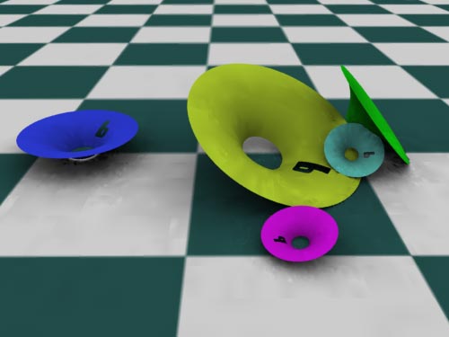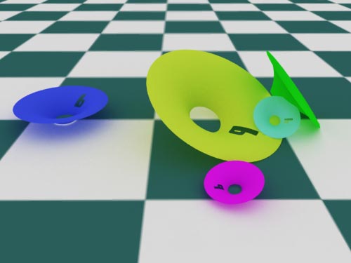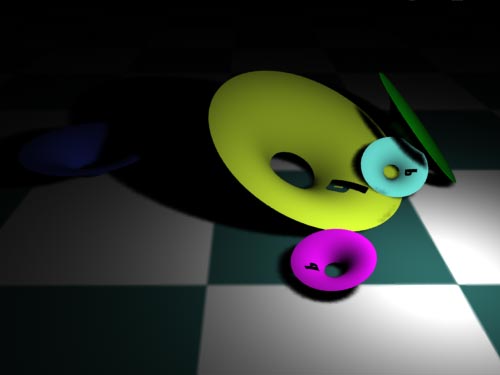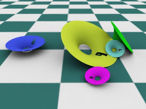 Setup: The scene consists of five trimmed NURBS surfaces lying on the ground. Only one area light lights the scene. Nothing else. Renderman creates a pleasingly warm look with smooth (depth map) shadows. |
