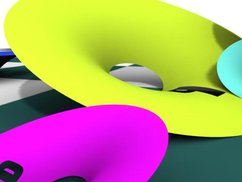 Die Aufstellung: fünf getrimmte NURBS-Flächen, die auf dem Boden herumliegen. Ein Flächenlicht (Area Light) von rechts oben. Nichts weiter. Renderman erzeugt hier eine angenehm warme Stimmung mit weichen Schatten. |