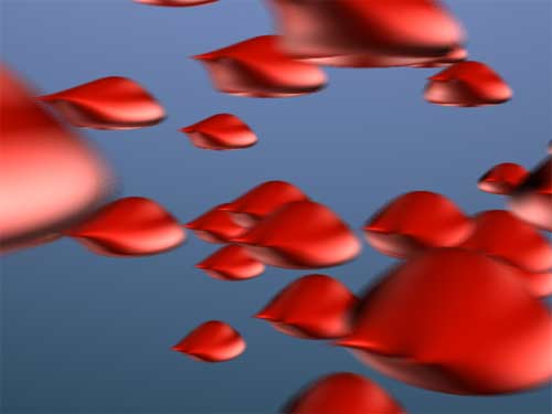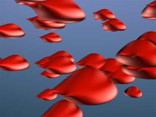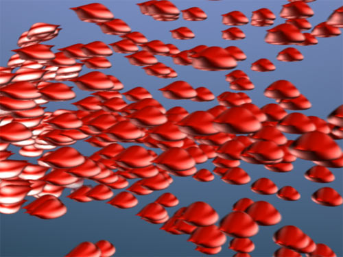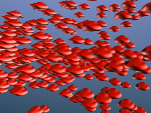 Bei den vorangegangenen Bildern mussten die Render-Programme mit etwa 18 Objekten umgehen. Ich habe jetzt die Geschwindigkeit und Ausstoßrate der Partikel erhöht, sodass die Kamera etwa 200 bewegte Objekte vor sich sieht. Der Motion Blur-Effekt in dem Bild links ist wunderbar, aber er kostete Mental Ray auch ordentlich Zeit: 13 Minuten und 17 Sekunden - Zeit für eine Kaffeepause. |