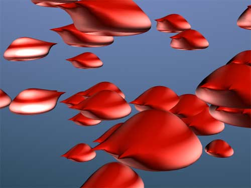 In the previous scenes the renderer had to deal with about 18 objects. Now I changed the speed and rate of the particle emission. Here you see about 200 objects in motion. The smooth motion blur effect in the image on the right took Mental Ray 13 minutes and 17 seconds to render - time for a coffee break. | ![]() |