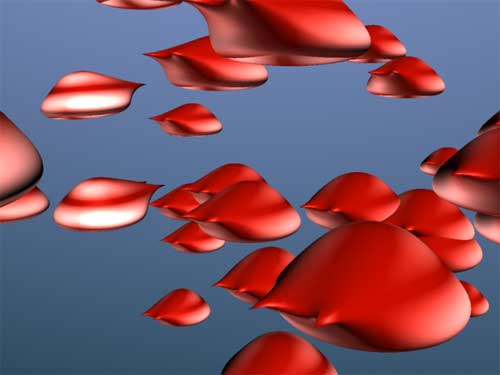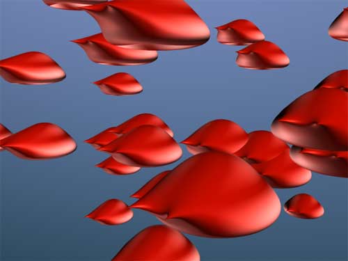 Renderman needs 12 seconds to render this image. Comparing the three images there's not much difference. The main differences is the way the renderers handle particle instancing. Mental Ray seems to step one frame ahead. Renderman ignores the change of rotation of the instanced objects. The surfaces on the left should actually show being rotated by 180° in Y. | ![]() |