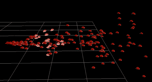 I started with a particle beam emitting particles into the scene. I used the Particle Instancer to replace the particles with the red objects you see on the right. Actually, they are subdivision cones with a few refinements. The reason for this setup: I wanted many objects at different speeds. And I wanted to see whether Renderman really handles subdiv surfaces. |