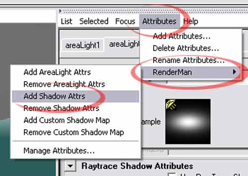 Adding shadow attributes is straight forward - once you know the philosophy. In the light shape node you find a "RenderMan" submenu under "Attributes". We choose the "Add Shadow Attrs" option. |