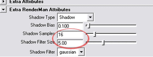 The new attributes can be found further down in the light's Attribute Editor under "Extra RenderMan Attributes". Increasing either the Shadow Samples or the Shadow Filter Size (or both) increases rendering time and improves the quality of the shadow. |