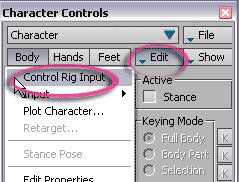It seems that nothing has happend to the character in the Viewer, even in X-Ray mode. You could feed in motion capturing data at this point. But you cannot animate Mia by hand. There's nothing to pick in the Character Controls window. This is what we'll do next: From the Edit menu in the Character Controls window choose "Control Rig Input". |