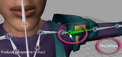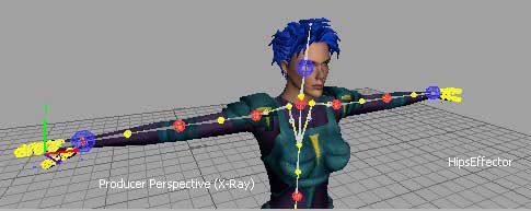 Mit diesem letzten Klick ist Mia vollständig animationsfähig. Endlich! In der Röntgendarstellung sehen Sie nun das Skelett, wie es mit verschiedenfarbigen Punkten ausgestattet sind. An diesen Punkten können Sie anfassen und drehen bzw. bewegen. In der Regel werden Sie aber die Stellvertreterfigur im Character Control-Fenster benutzen, um Arme, Beine etc. auszuwählen. |