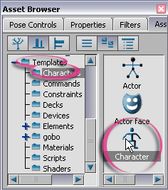 Holen Sie dazu aus dem Asset Browser eine Vorlage, ein "Template", und zwar den "Character". Das ist etwas Abstraktes, mit dem man alleine nicht viel anfangen kann. Diese Vorlage beschreibt den Knochenaufbau einer Figur, ist jedoch selbst weder Knochen, noch Geometrie. |