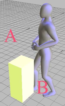 Bei angeklicktem Haupt-Anpacker können Sie nun im Viewer-Fenster die Figur vom Ursprung (A) vor den Quader bewegen und entsprechend drehen: |