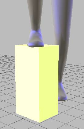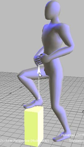 First, load a characterized and rigged character into the scene. I use the "humanoid" from the installation CD as in previous cases. Our goal is to make the character stand in front of the yellow cube, with his right foot planted on the top of the cube and the dimensions adjusted properly. |